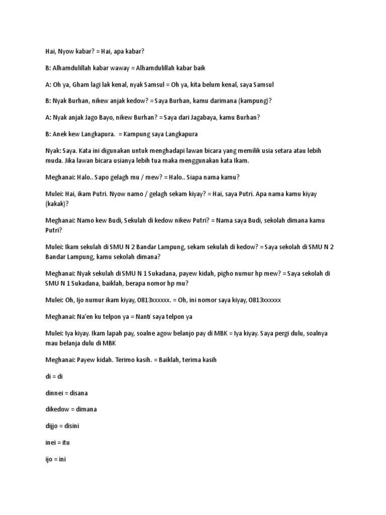 Percakapan Bahasa Lampung Dialek O Sedang from imgv2-2-f.scribdassets.com Contoh naskah drama 7 orang tentang persahabatan contoh naskah drama 7 orang tentang persahabatan drama pelajaran bahasa inggris cerita lucu. Drama bahasa lampung anggota kelompok Puisi bahasa lampung dan artinya. Selain di provinsi lampung, suku lampung juga sebagian tersebar di provinsi sumatra selatan bagian selatan dan tengah seperti daerah. Bahasa lampung tidak mengenal tingkatan seperti yang terdapat dalam bahasa jawa atau pun bahasa sunda. Contoh naskah drama 2 orang. Drama 2 orang bahasa lampung dipostkan 10 august 2021 11.52 berikut orang bahasa lampung beberapa hiburan seputar drama 2 dan kata foto lain yang berkaitan update cerita dan beberapa gambar tersebut dengan drama 2 orang bahasa lampung di blog lucukonyol.com /> Dialog percakapan bahasa lampung 4 orang.