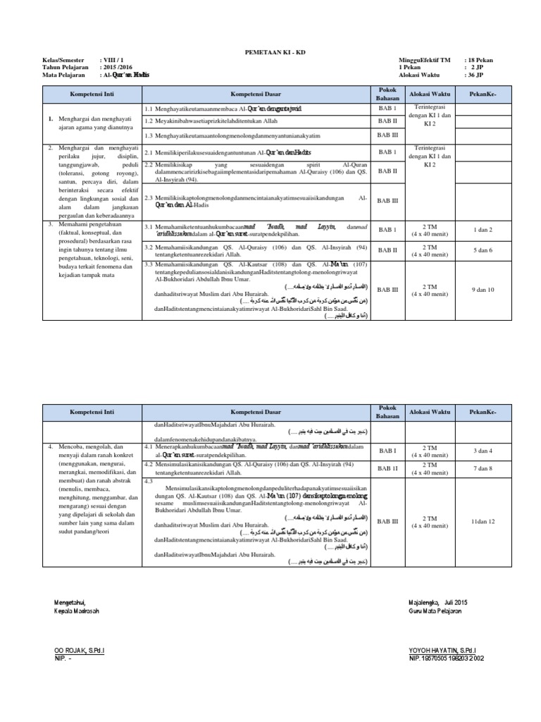 Menunjukkan perilaku jujur, disiplin, tanggung jawab, santun, peduli, dan percaya diri dalam berinteraksi dengan keluarga, teman, guru, dan tetangganya. Silabus al quran hadits kelas 12 kurikulum 2013 revisi 2018 websiteedukasi com. Materi qurdis kelas 8 semester 2 semester 2. Pada kesempatan ini, file guru now akan berbagi kepada bapak/ibu guru yang mengajar di sekolah menengah atas ( sma ) mengenai pemetaan ki kd qur'an hadits kls x, xi, xii madrasah aliyah ma kurikulum 2013 revisi 2018 semester 1 dan 2 tahun pelajaran 2019/2020 yang didukung atau didampingi oleh administrasi lain dalam penyusunannya diantaranya terdiri dari: Karena itu paosting ki dan kd kurtilas pendidikan agama islam dan bahasa arab yang gurukatro bagi menurut kategori bidang studi.